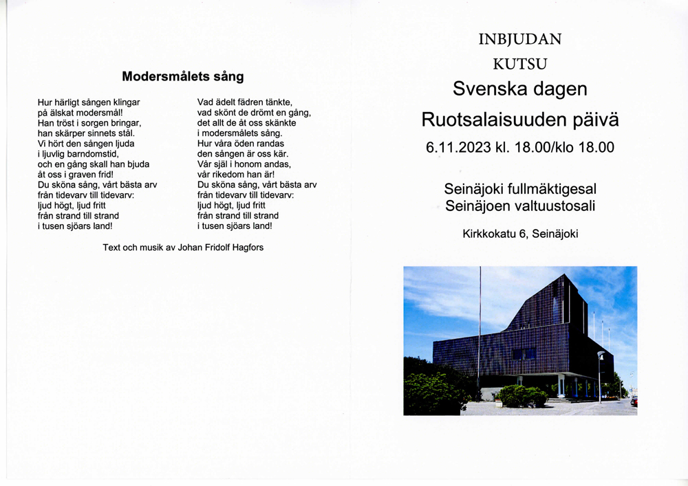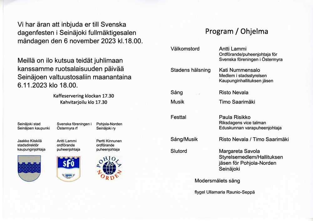Vi har som tidigare år fått en inbjudan att delta i Svenska dagenfest i Seinäjoki. Festen hålls i fullmäktigesalen måndagen den 6 november 2023 kl. 18.00. Kaffeservering klockan 17.30. Festen ordnas av Seinäjoki stad, Svenska föreningen i Östermyra rf och Pohjola-Norden ry. Festtalet hålls av riksdagens vice talman Paula Risikko. Se bifogad inbjudan.